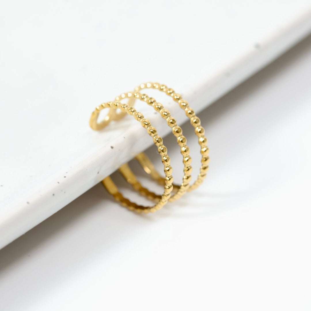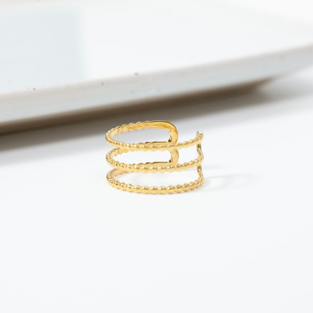 Son anneau ouvert à triple rang apporte du caractère tout en restant fin et élégant.