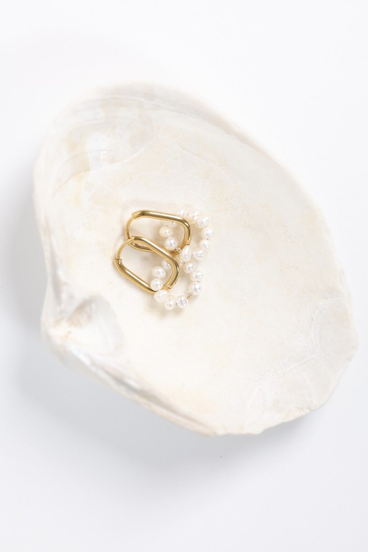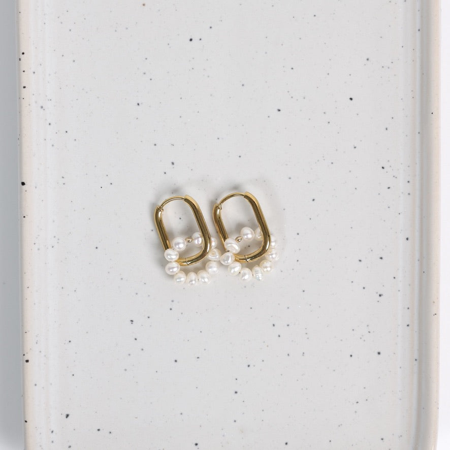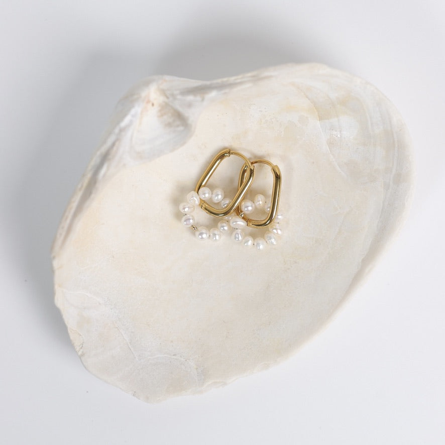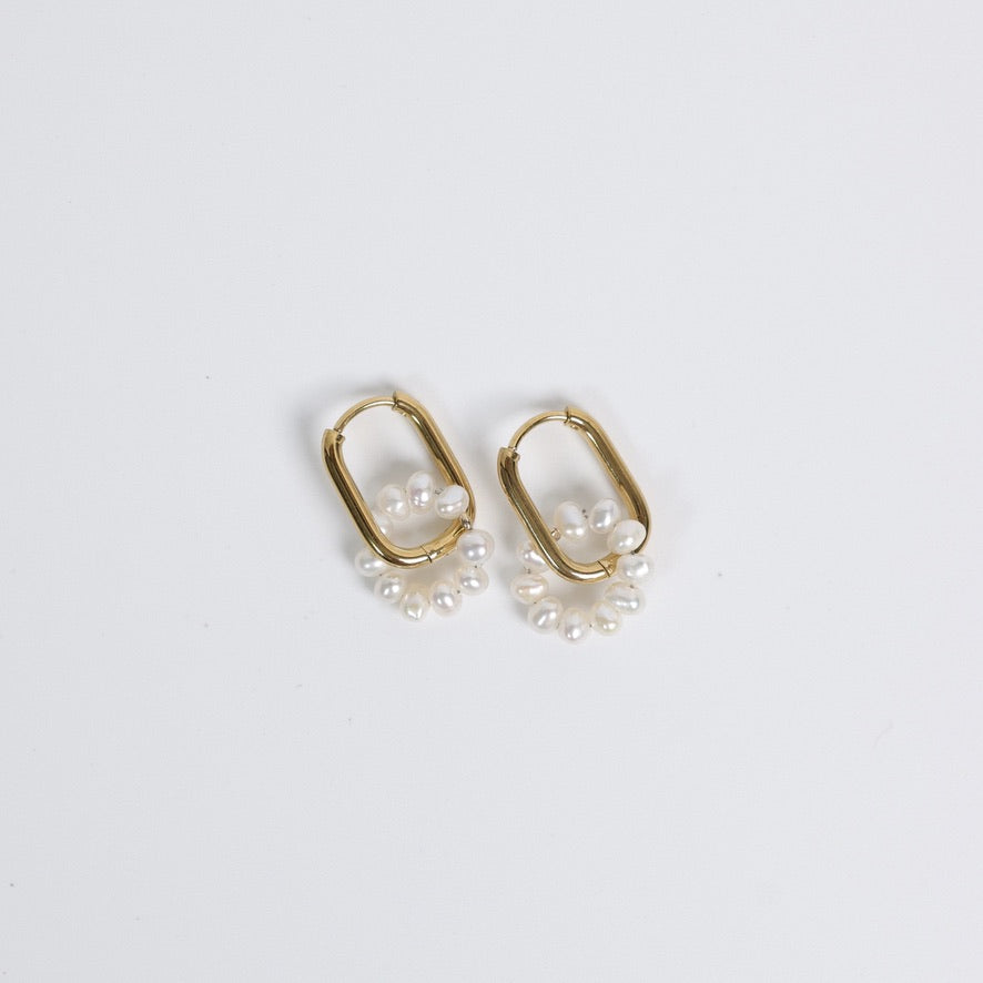 Délicates et lumineuses, les boucles d’oreilles Flavie mettent en valeur de jolis anneaux rectangulaires en acier inoxydable doré, ornés de petites perles d’eau douce assemblées en forme de fleur.