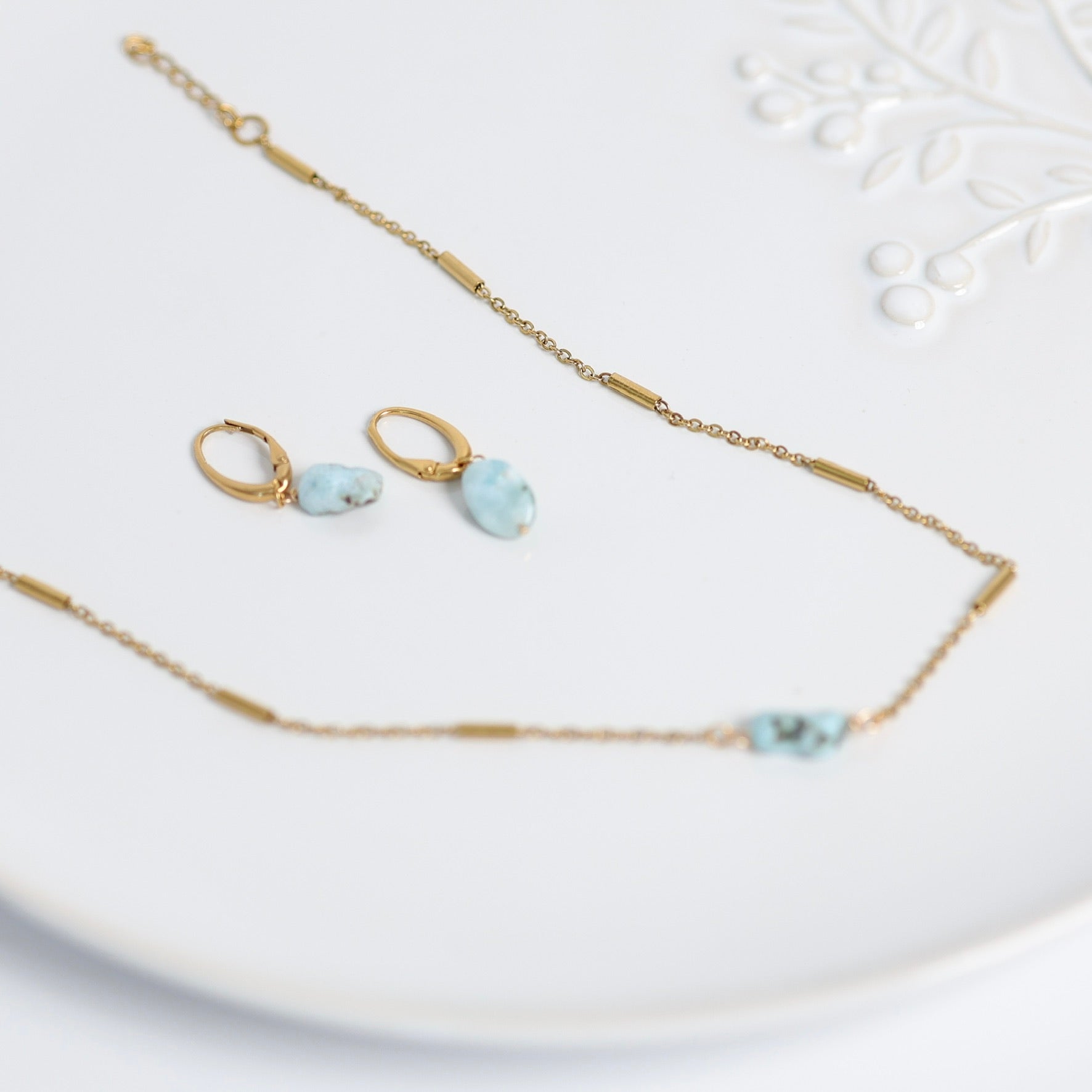 Le larimar, pierre naturelle unique, apporte une touche lumineuse et apaisante à ces boucles intemporelles.