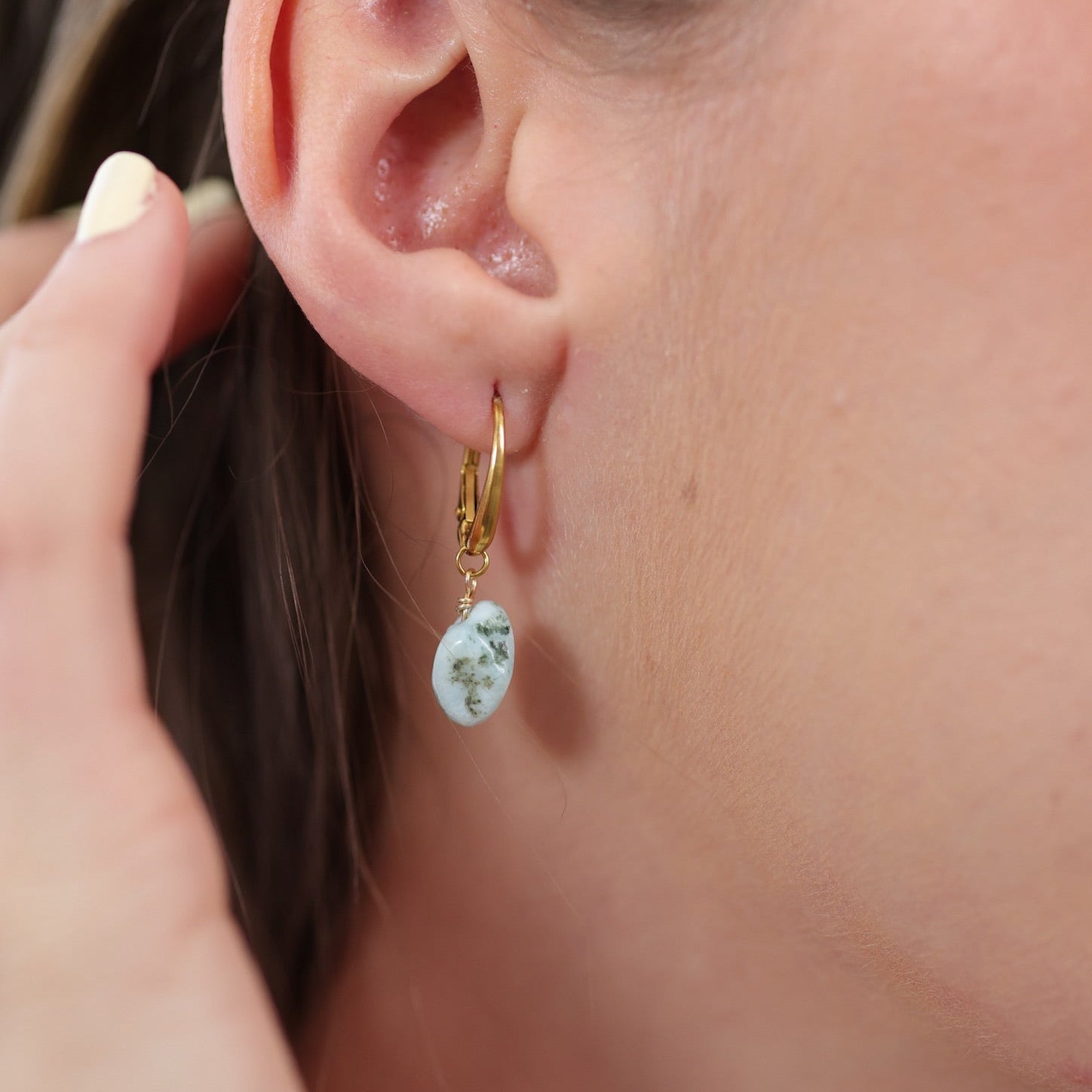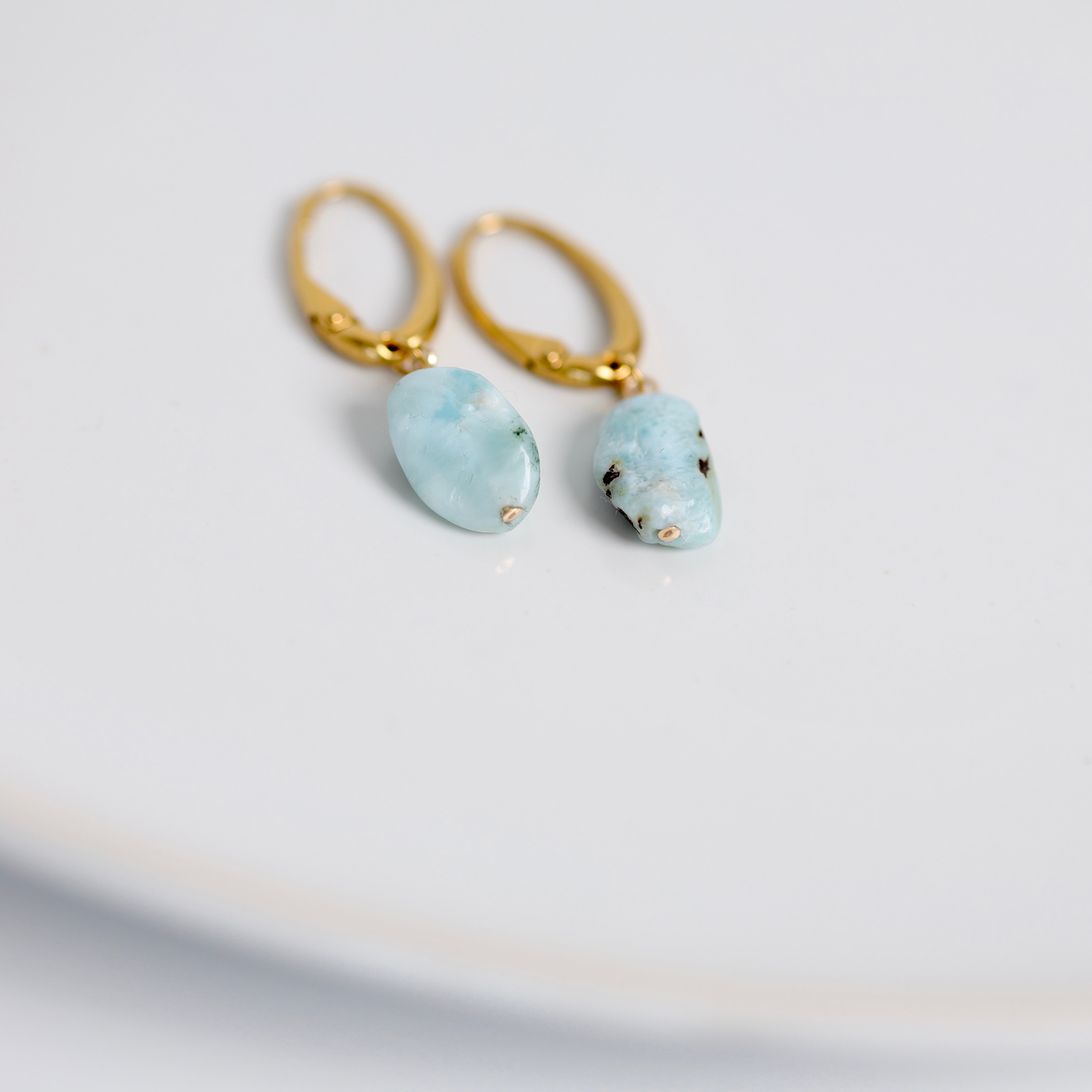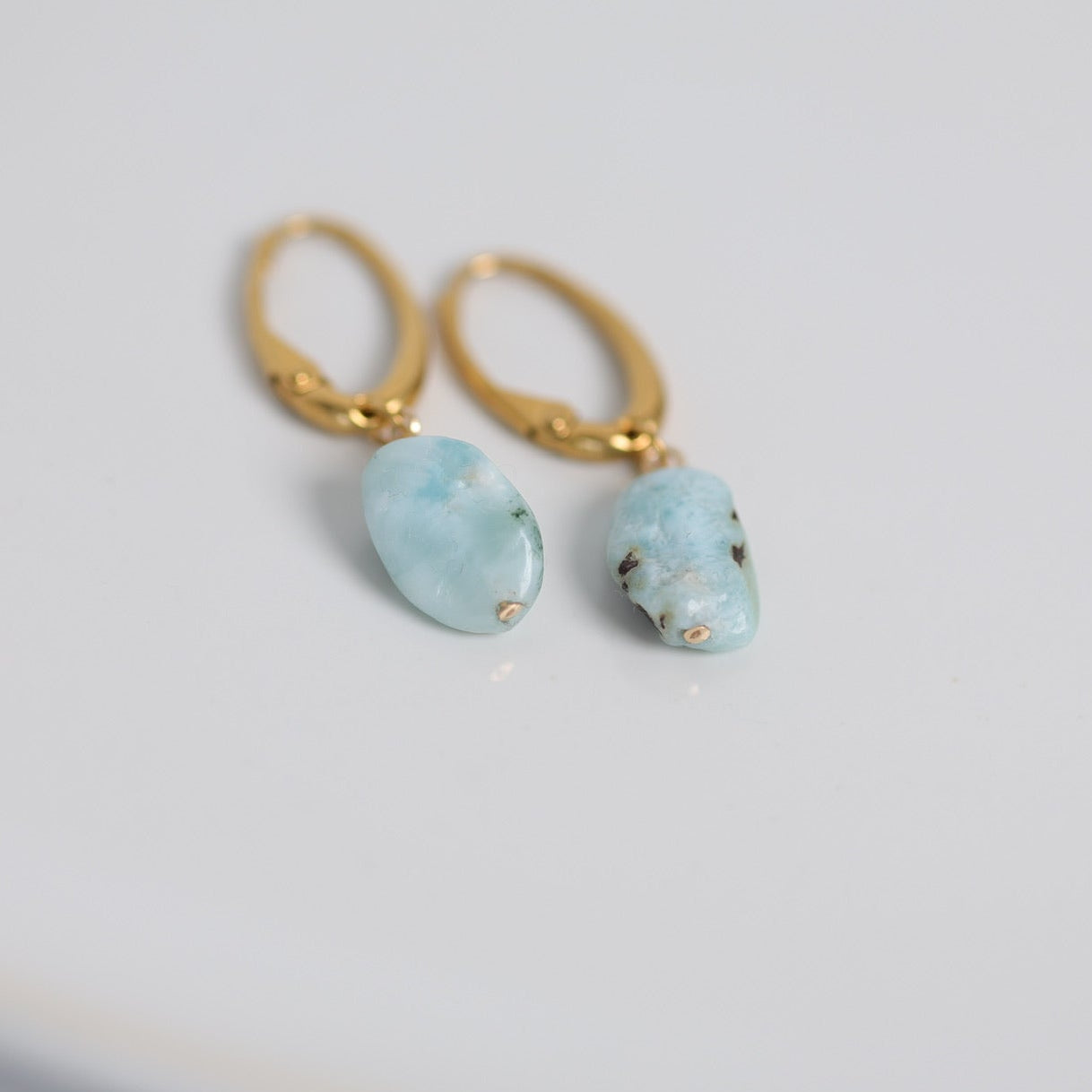 Les boucles Léa se distinguent par leur design délicat et leur pierre naturelle de larimar, aux teintes bleu pâle rappelant la mer et la douceur.