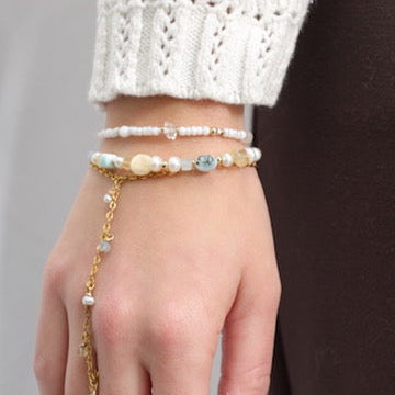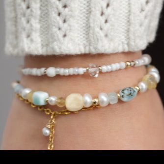 Le bracelet Anaëlle évoque la douceur et la lumière avec son mélange harmonieux de pierres naturelles aux tons crème et bleu pâle, ponctuées de perles délicates.