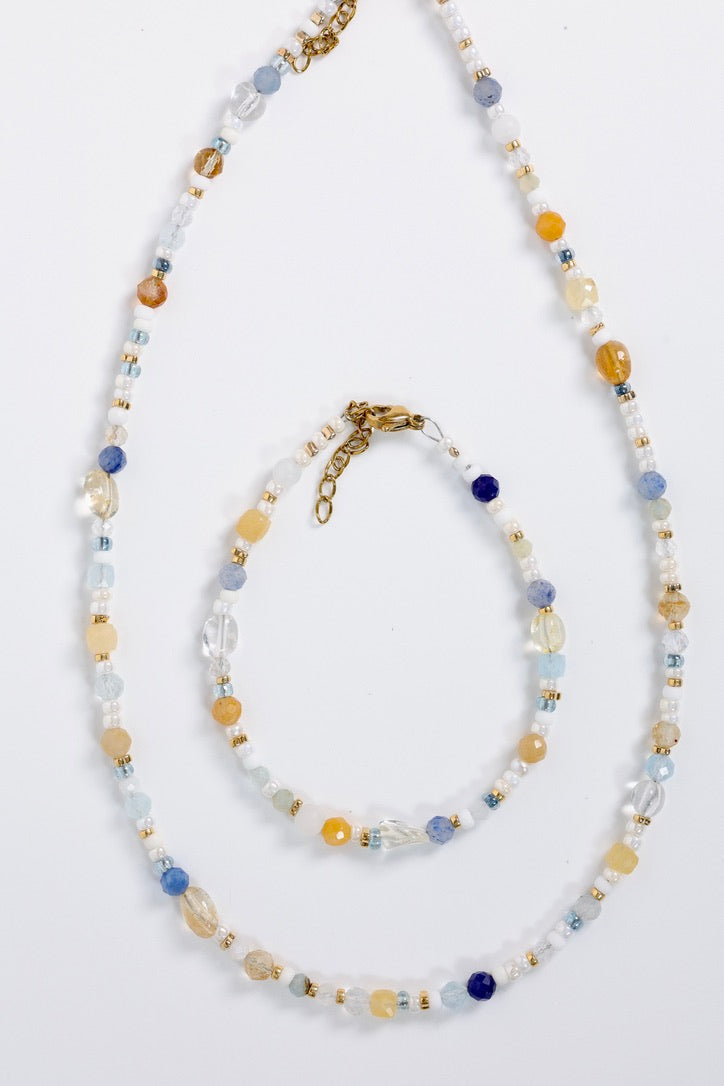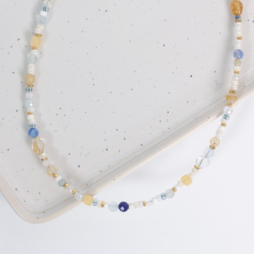 Le collier Aurellia est une pièce douce, lumineuse et remplie de couleurs subtiles, composée de perles de culture et de pierres naturelles dans des tons bleu ciel, bleu profond, pêche, beige et jaune doré.