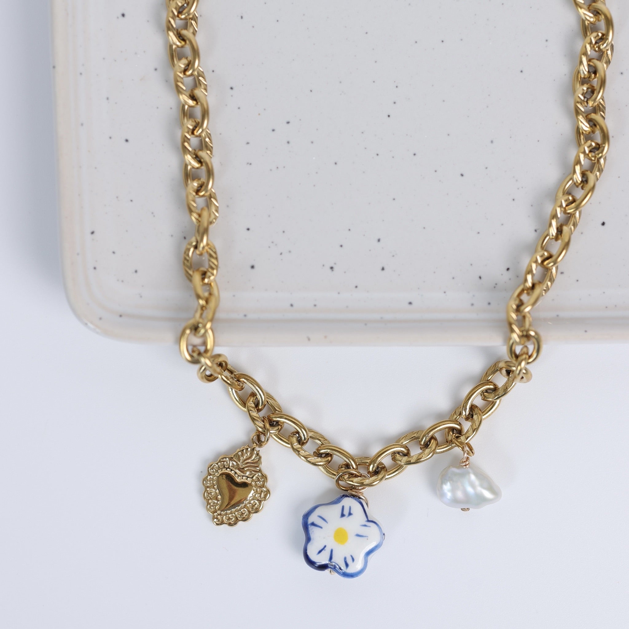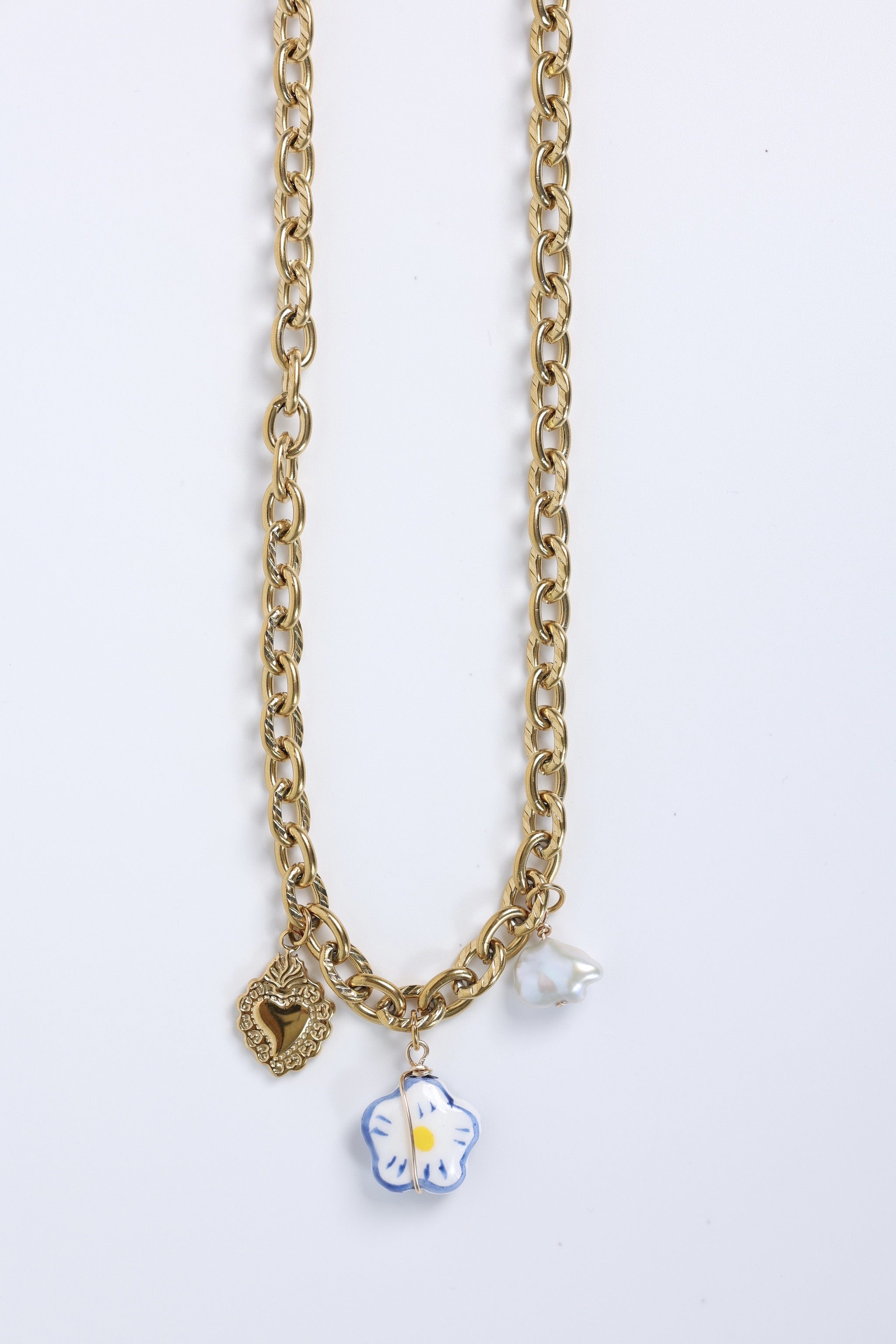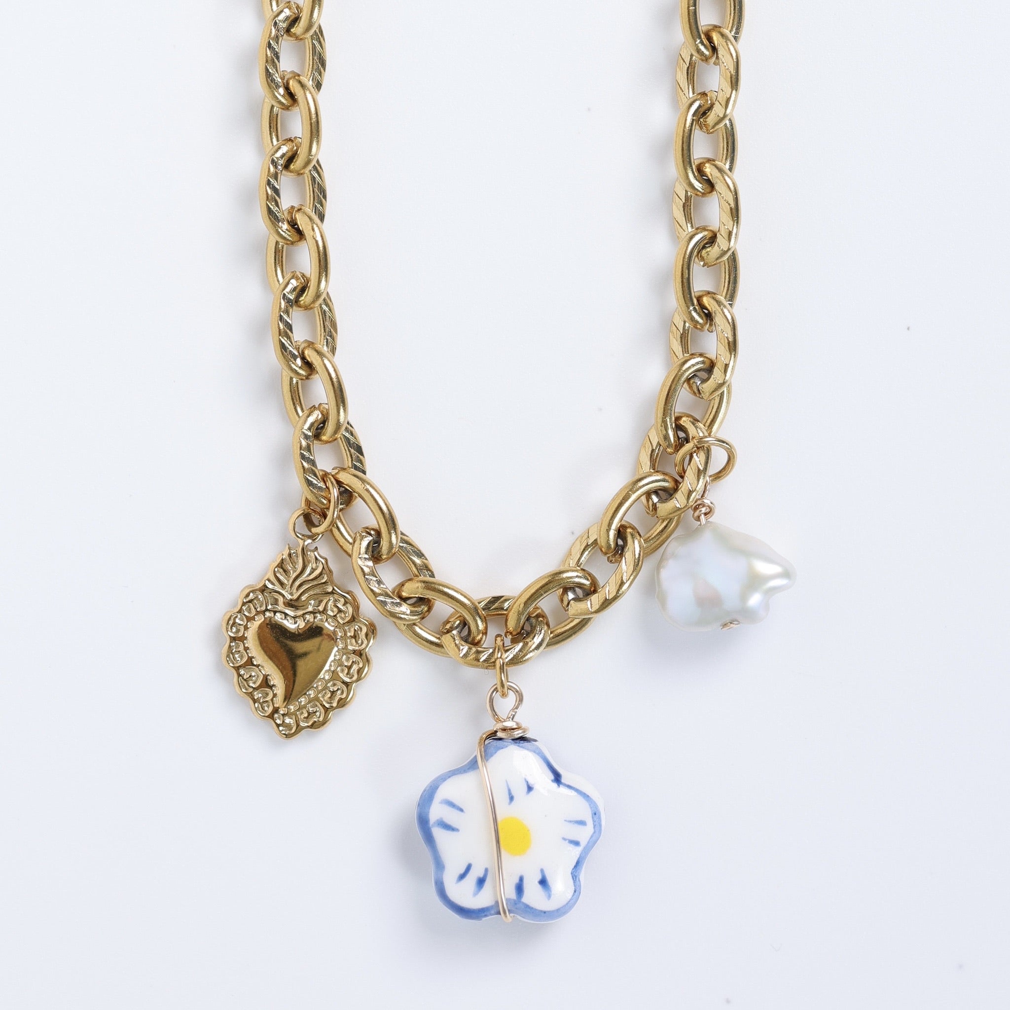 Audacieux et lumineux, le collier Charlie se distingue par sa chaîne à grosses mailles en acier inoxydable doré, rehaussée de trois breloques délicates : un cœur texturé, une fleur en céramique entourée d’un fil doré et une perle naturelle.