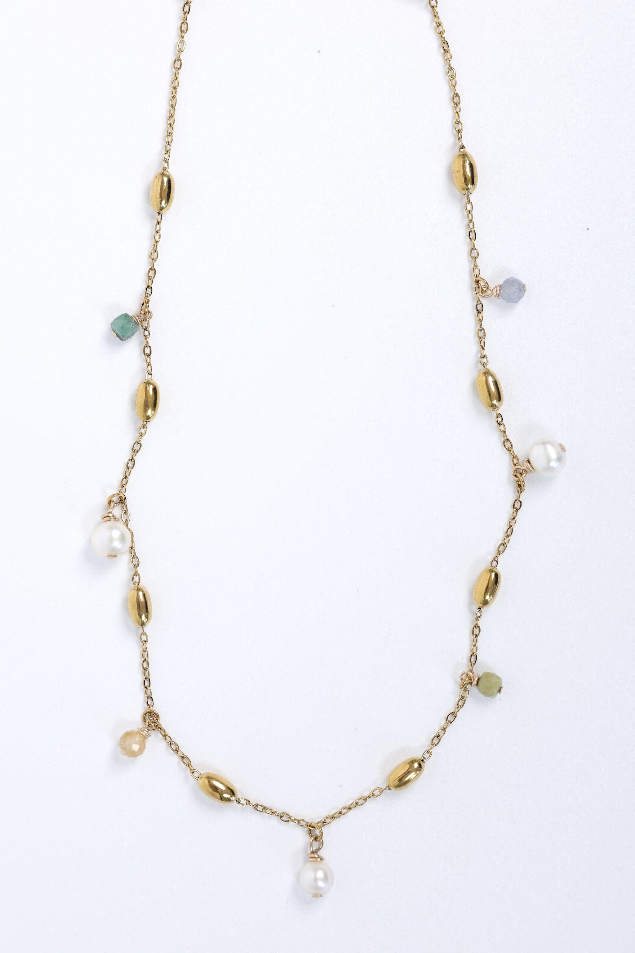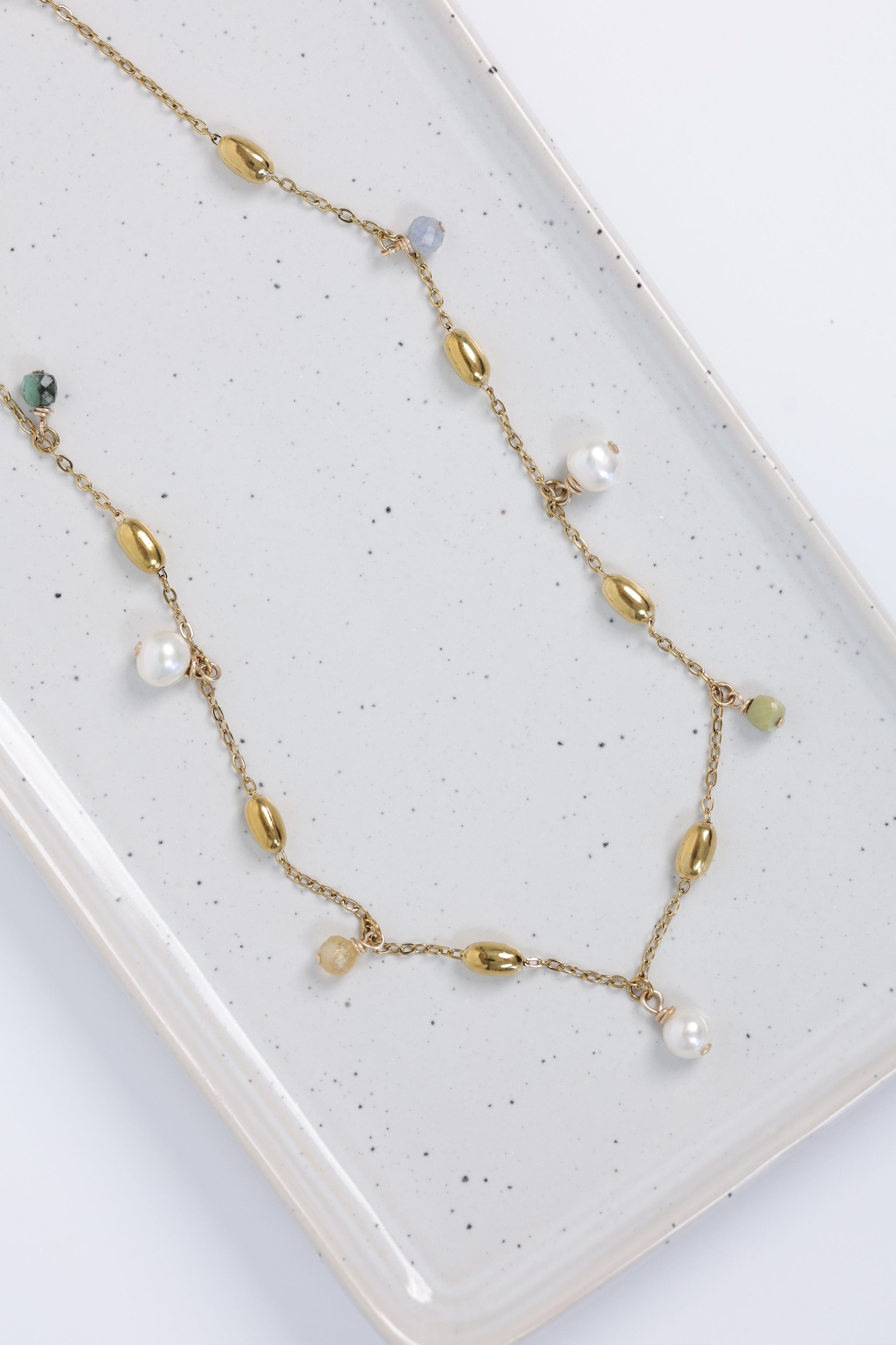 Délicat et lumineux, le collier Dune est un bijou signature inspiré par la mer, le sable chaud et les trésors naturels. Sa chaîne en acier inoxydable doré, ponctuée de maillons ovales, est sublimée par de fines pierres naturelles et des perles d’eau douce qui viennent danser tout autour du cou.