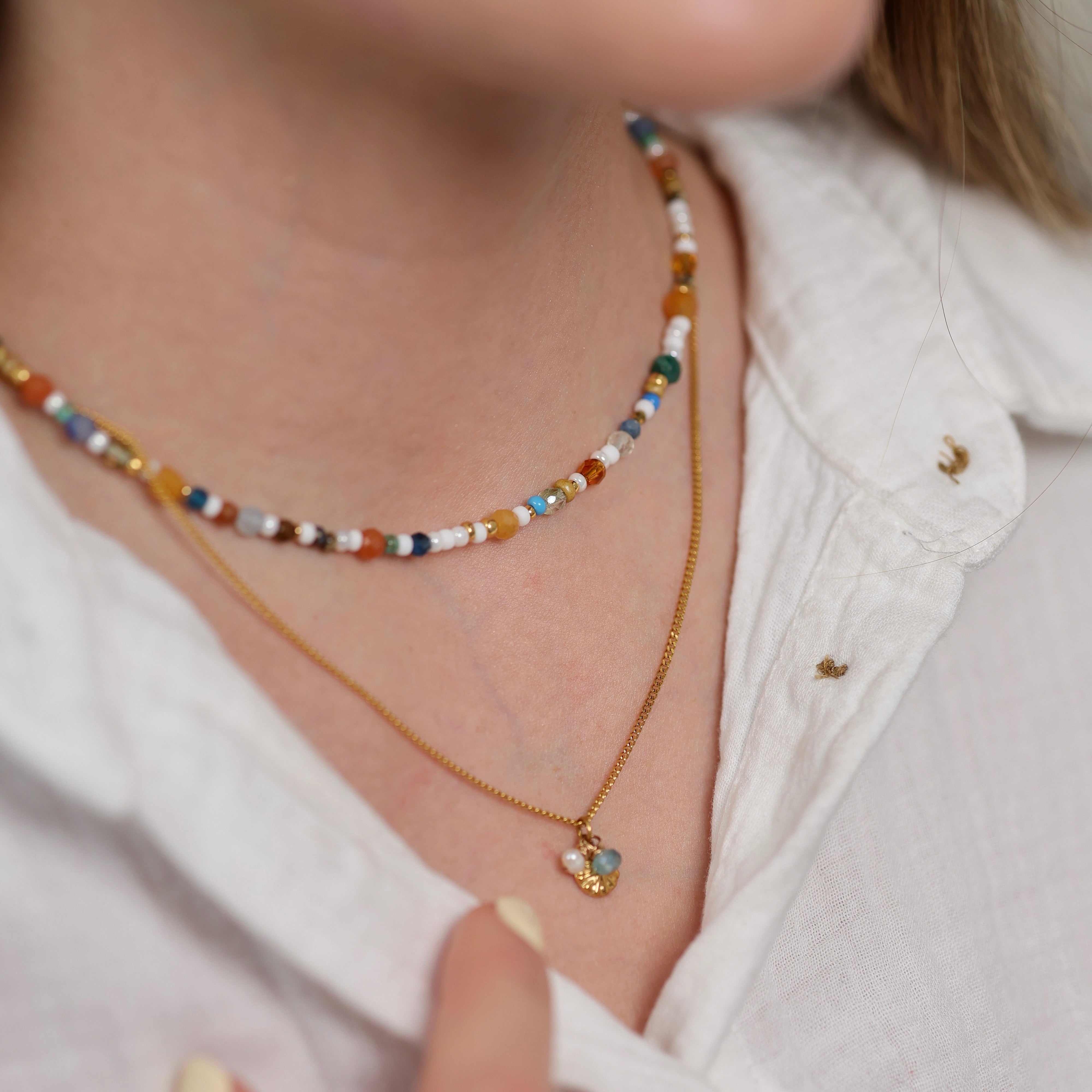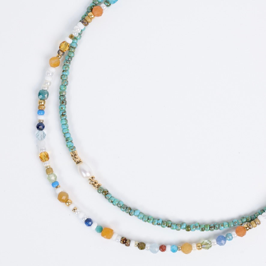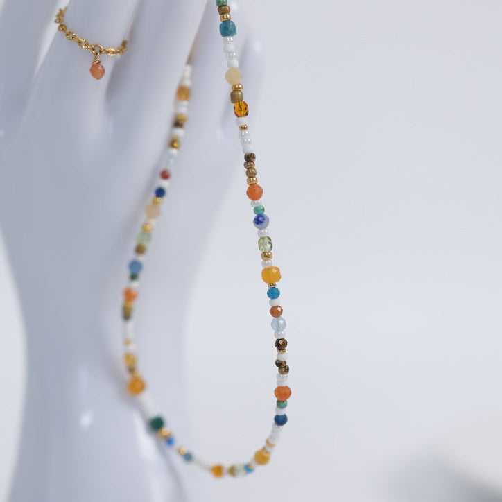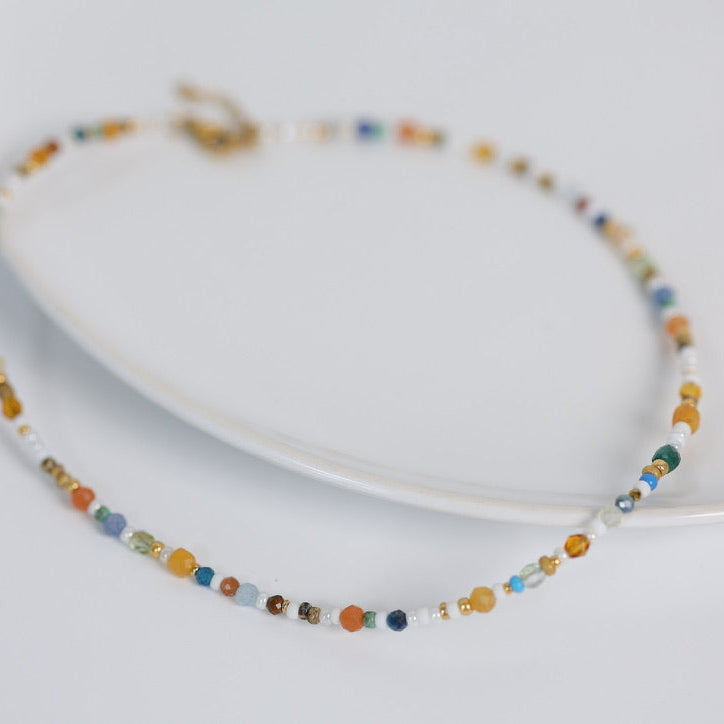 Rio, c’est ce petit collier facile à aimer, rempli de pierres naturelles aux nuances vibrantes, parfait seul ou en superposition avec d’autres colliers de la collection.