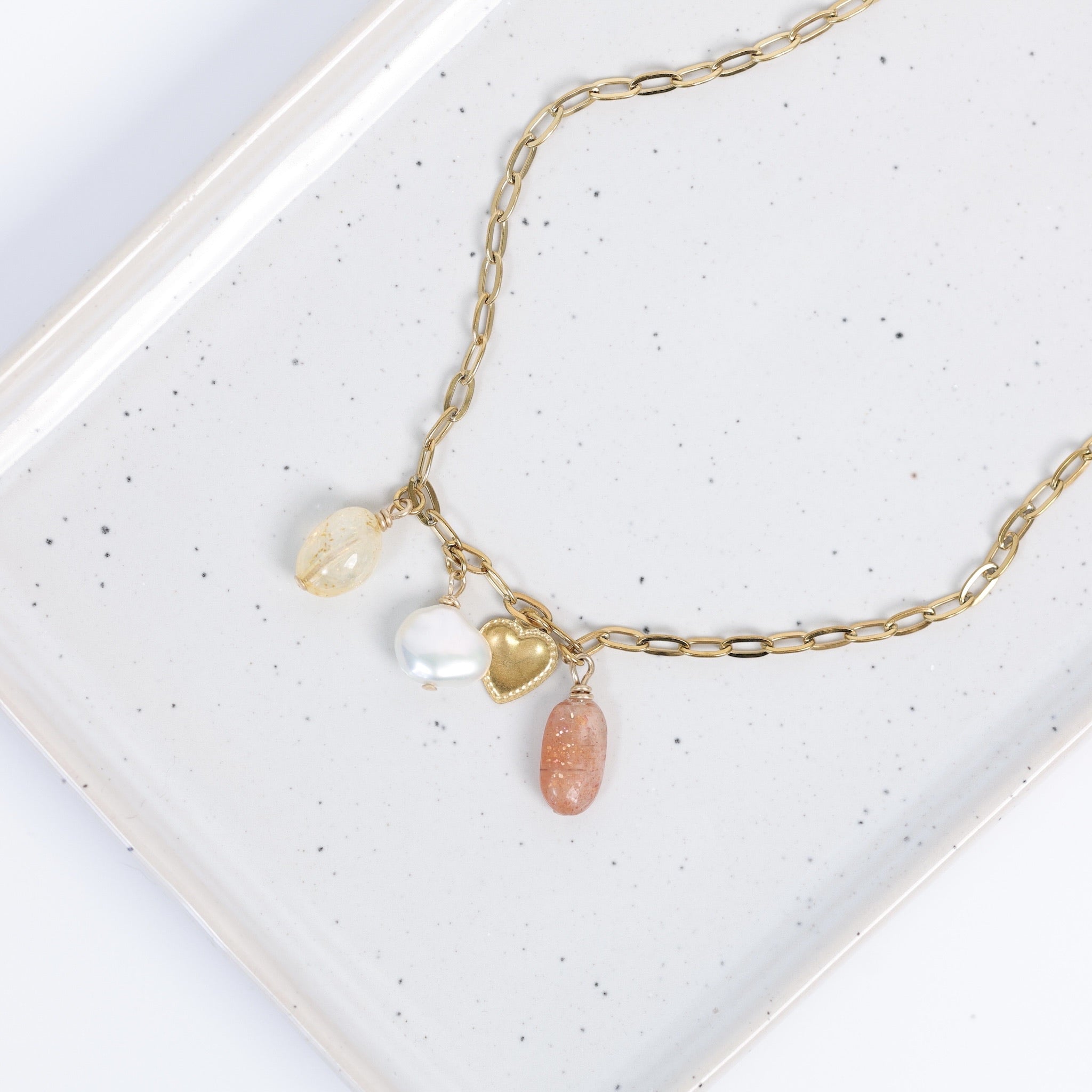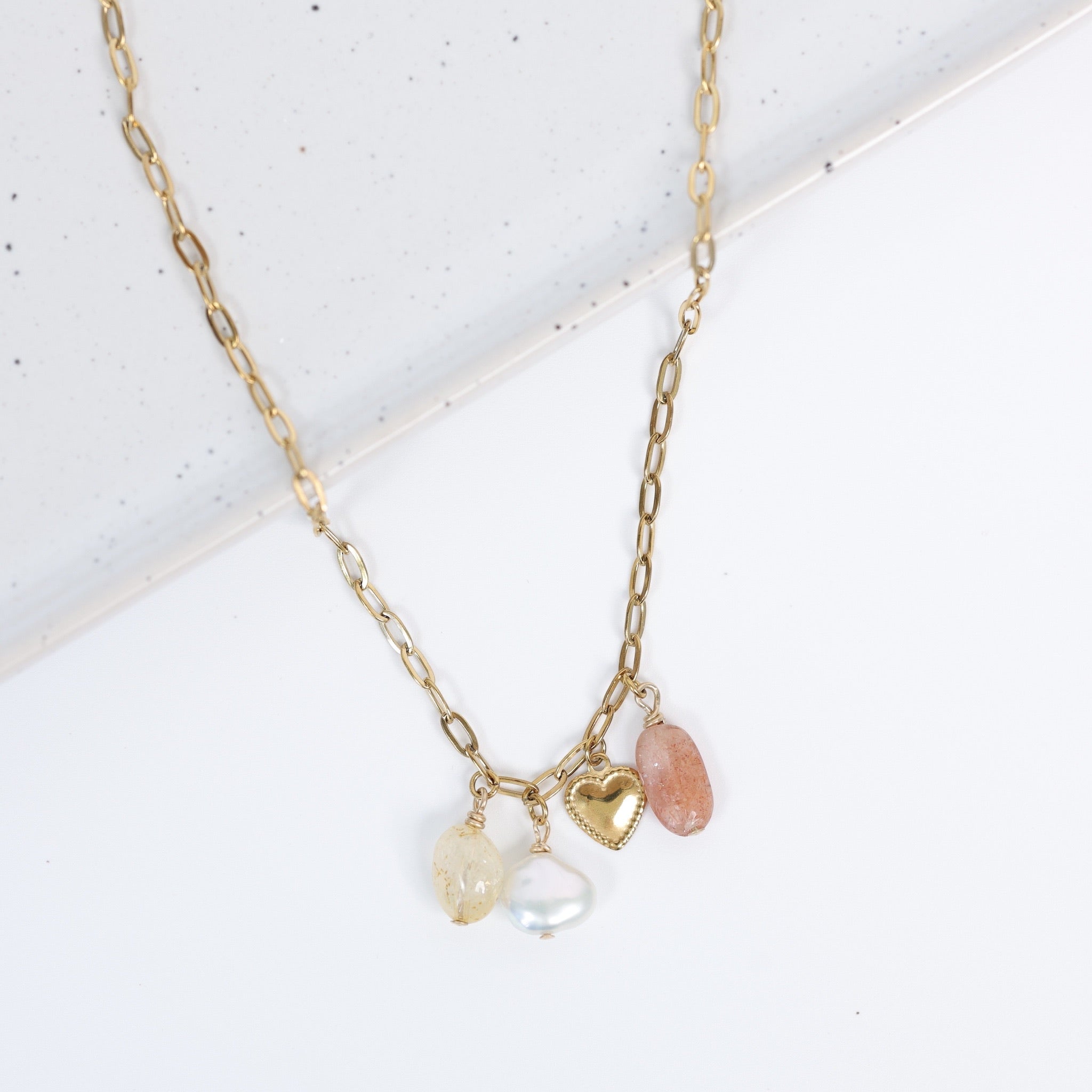 Délicat et lumineux, le collier Romy est un bijou empreint de douceur et de féminité. Sa fine chaîne trombone en acier inoxydable doré met en valeur une composition de pierres naturelles et de breloques délicates, incluant une pierre de soleil, une citrine, une perle d’eau douce et un petit cœur doré.
