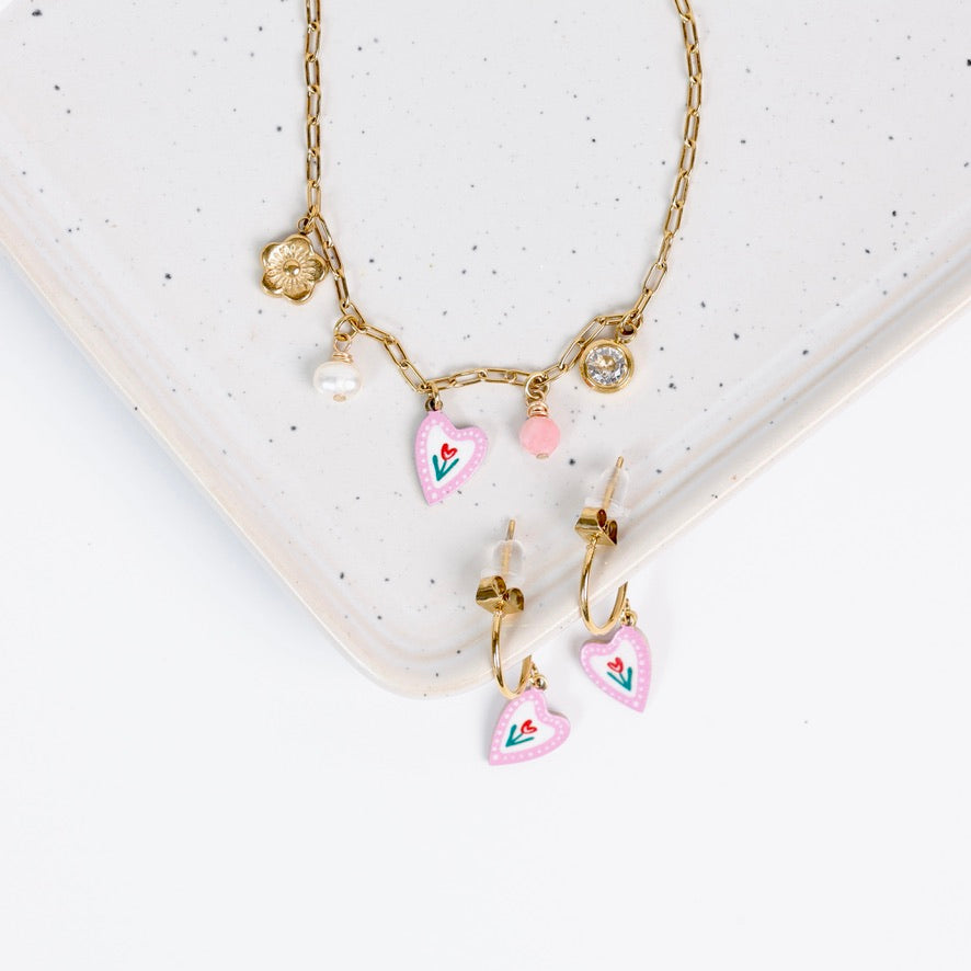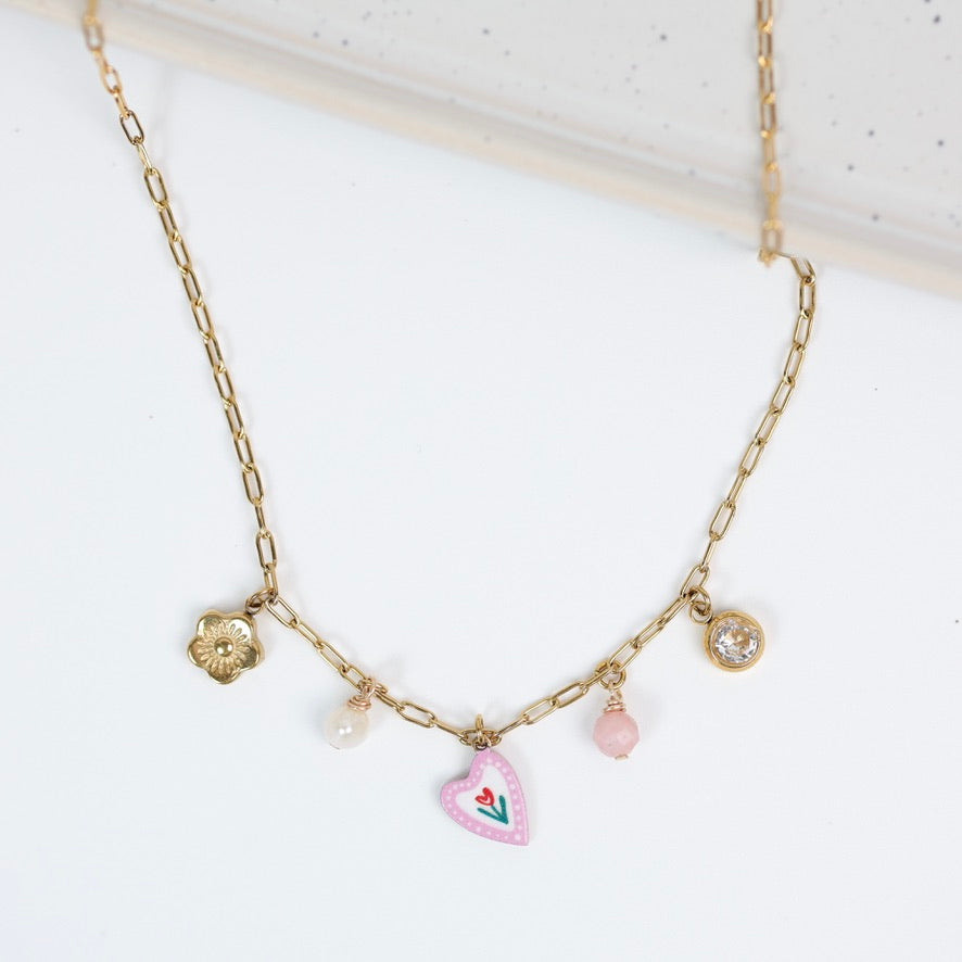 Rosalia est un collier délicat aux accents romantiques, imaginé comme une promenade parmi les fleurs. Sa chaîne trombone dorée est sublimée par un cœur pivoine aux teintes rosées, accompagné d’une perle de culture, d’une pierre facettée rose pâle et de breloques lumineuses qui captent la lumière avec subtilité.