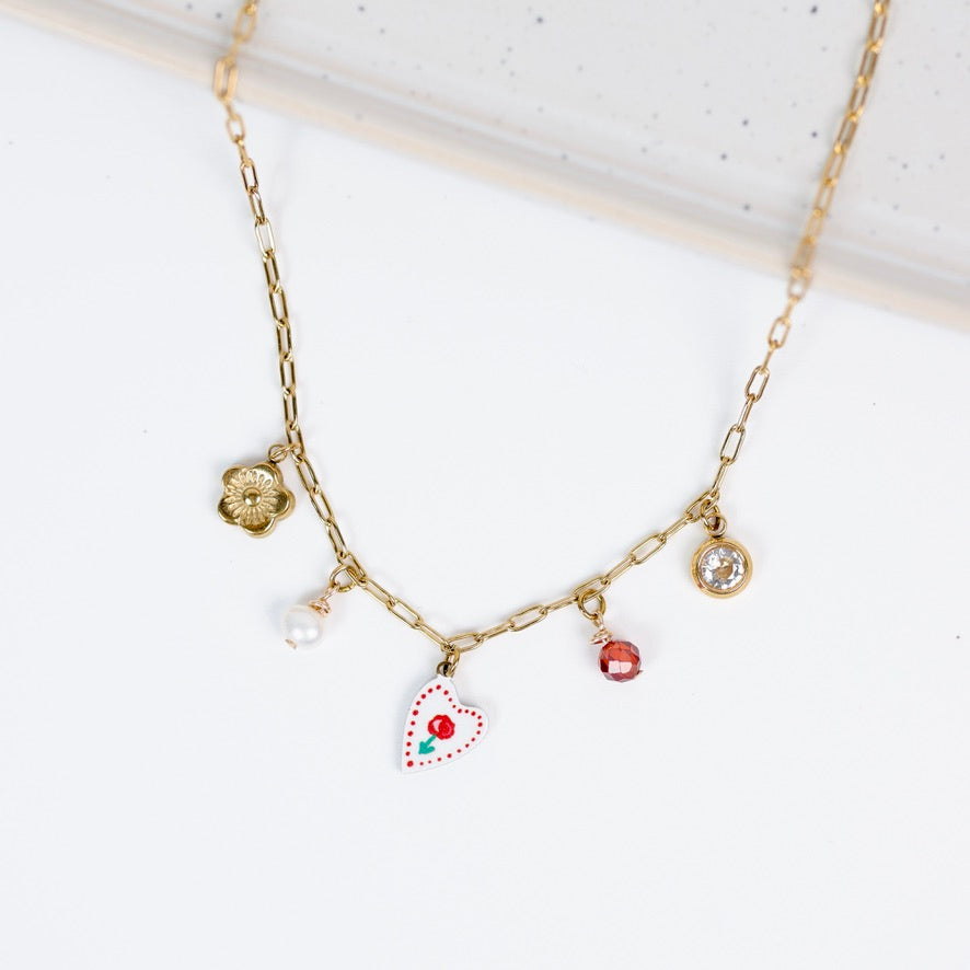 Le collier Valentina est une pièce délicate et lumineuse, pensée comme un bijou porte-bonheur. Sa chaîne trombone dorée accueille une mini composition de breloques soigneusement agencées, créant un équilibre entre romantisme et élégance.