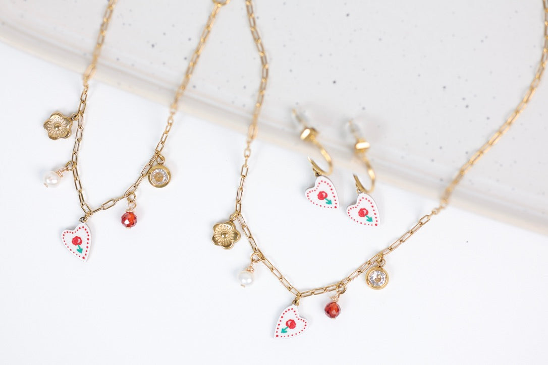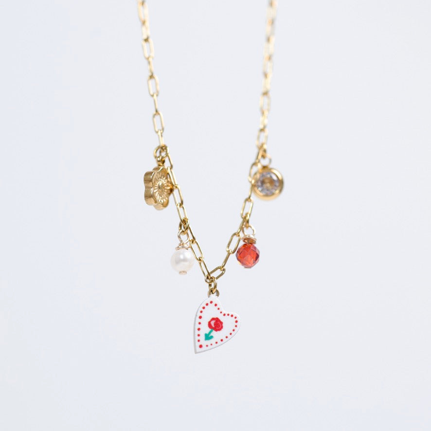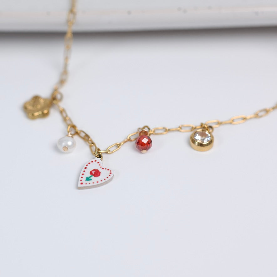 On y retrouve un cœur pivoine illustré, une perle de culture, une pierre facettée aux reflets chaleureux, une petite fleur dorée et une breloque en oxyde de zirconium qui apporte une touche de lumière subtile. Chaque détail est choisi pour rappeler la douceur de l’amour et l’art de vivre méditerranéen.