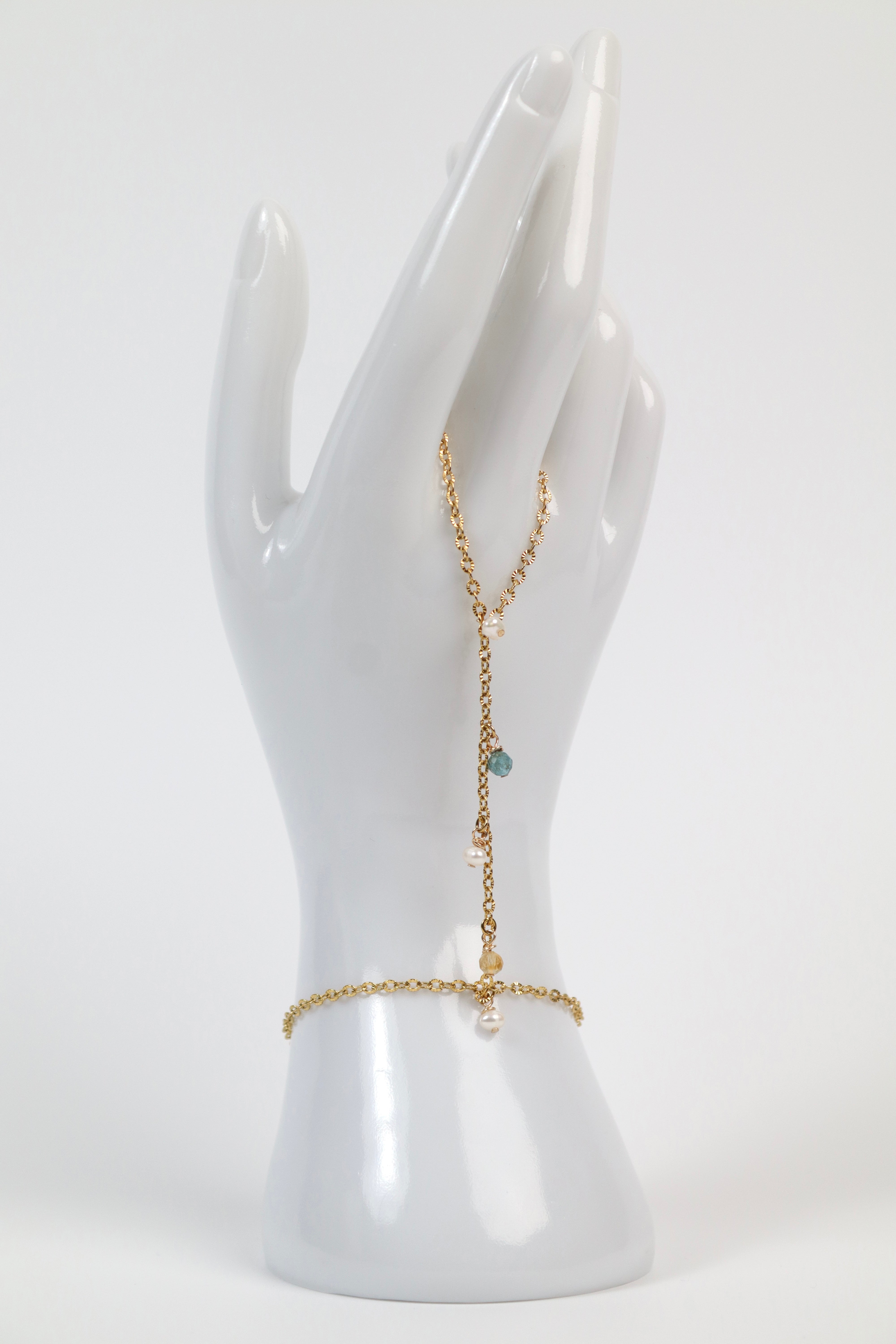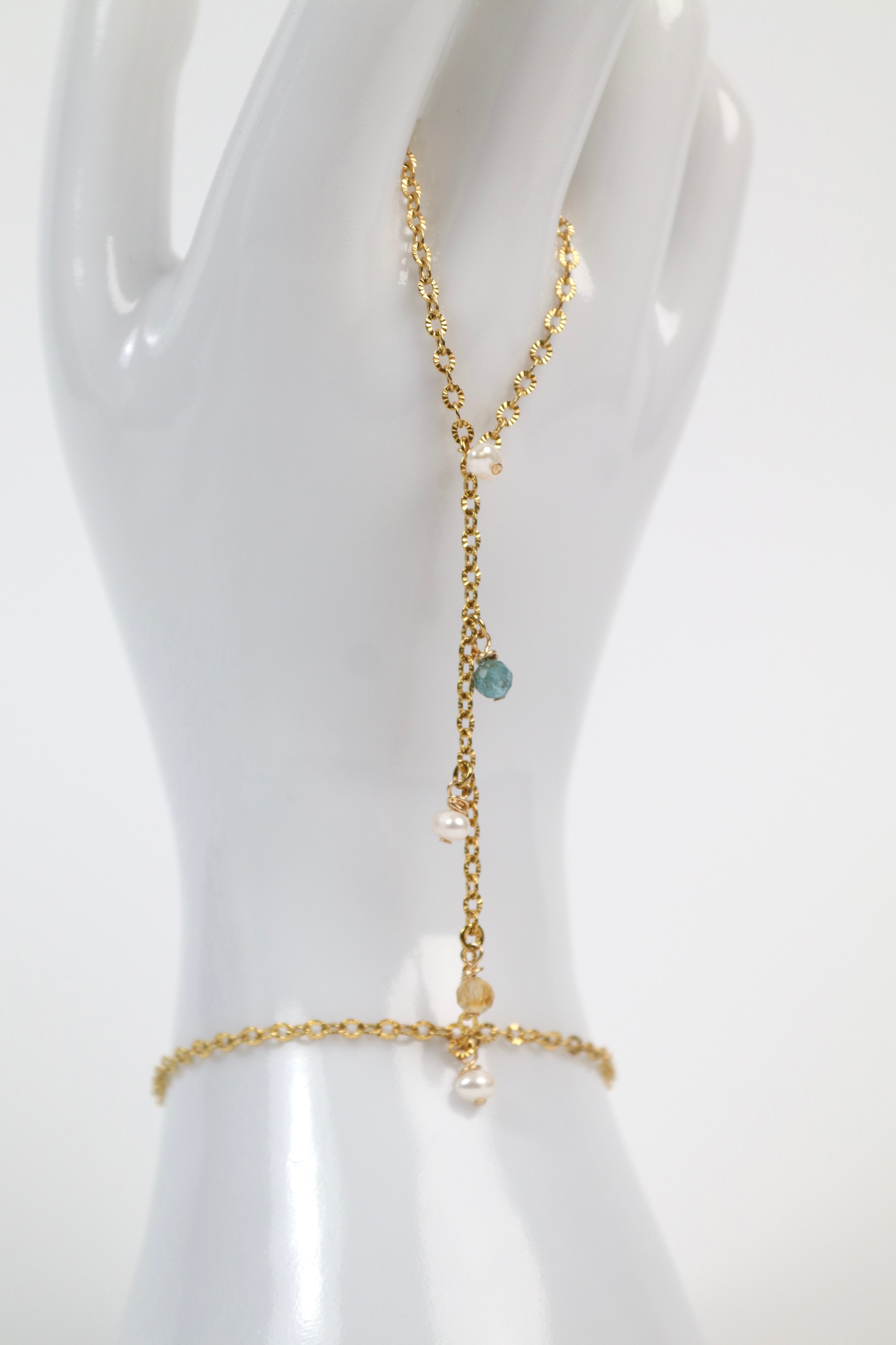Sa fine chaîne dorée relie un bracelet délicat à un anneau fin, ornée de petites perles d’eau douce et pierres naturelles aux teintes douces et lumineuses.