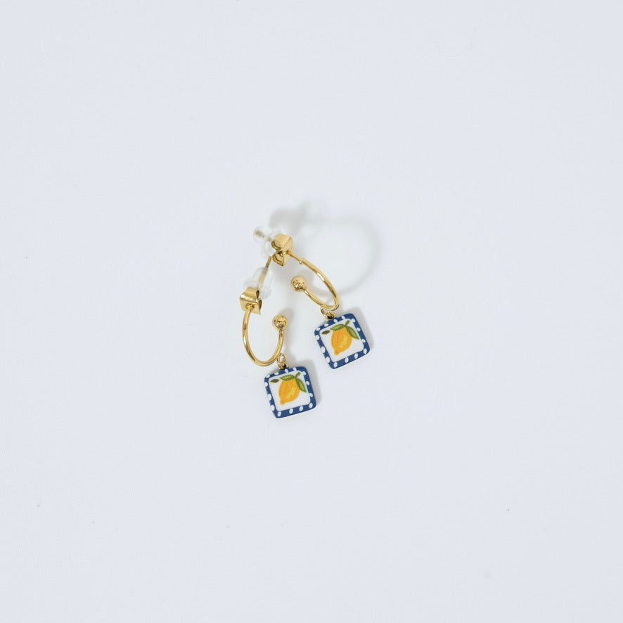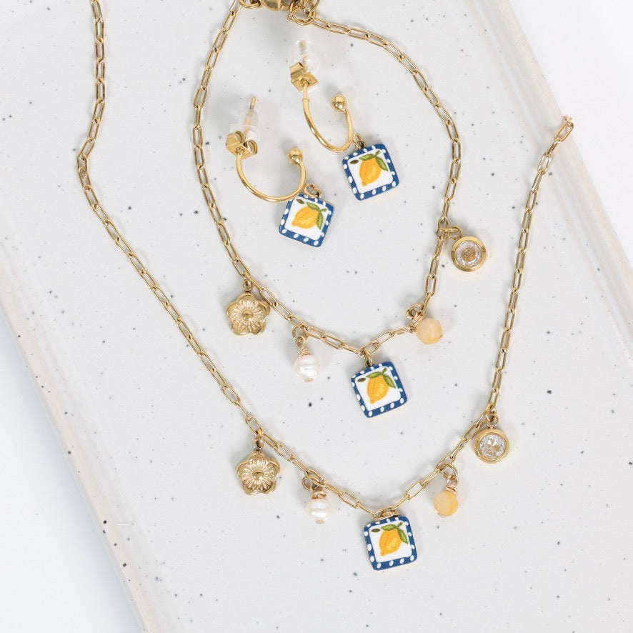 Inspirées de la côte amalfitaine, ces boucles d’oreilles évoquent le soleil, les agrumes et la dolce vita. Leur breloque carrée illustrée d’un citron apporte une touche méditerranéenne fraîche et originale, parfaitement mise en valeur par les créoles dorées.