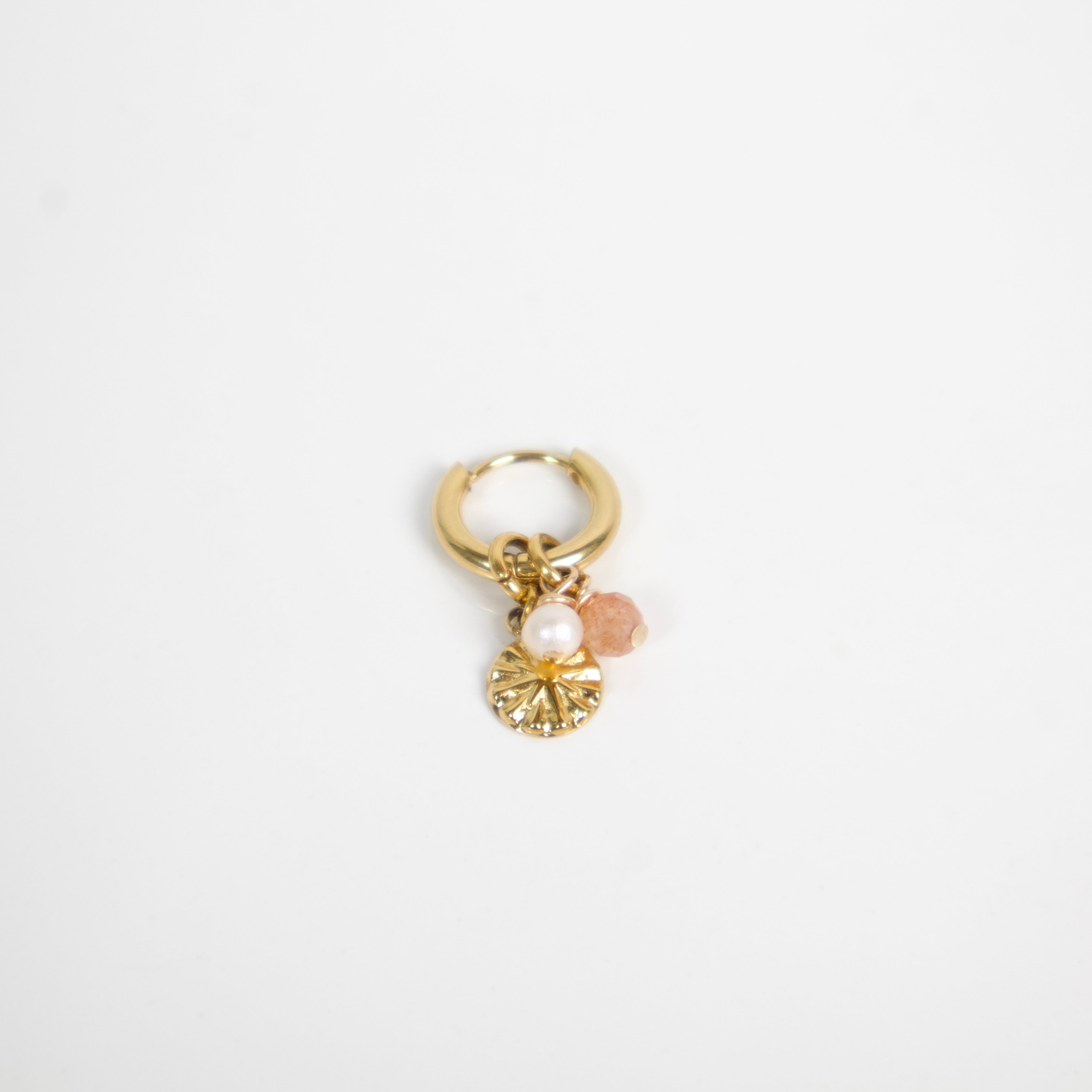 Boucles d’oreilles Solène – Médaillon doré, perle & pierre de soleil