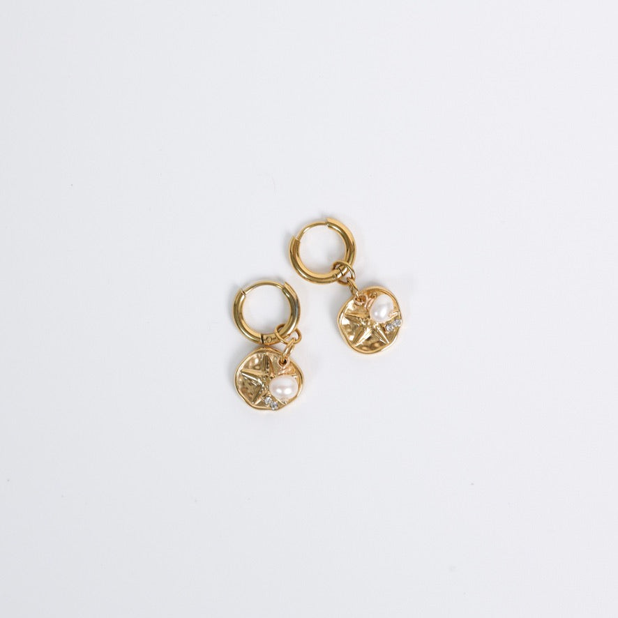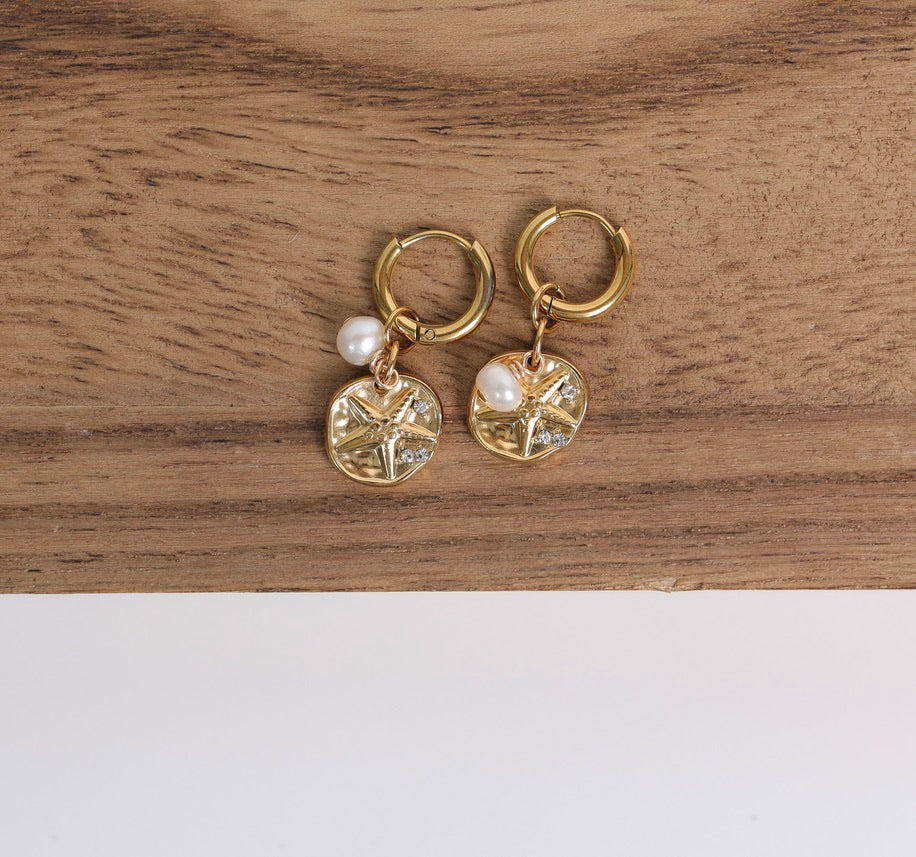 Délicates et raffinées, les boucles d’oreilles Simone allient élégance intemporelle et féminité lumineuse. Leur breloque ronde au relief irrégulier, ornée d’une étoile de mer scintillante et d’un zircon cubique, est sublimée par une perle de culture qui apporte douceur et sophistication.