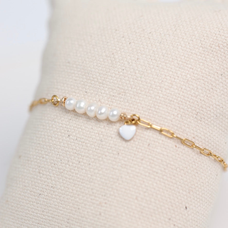 Ses perles de culture blanches, lumineuses et intemporelles, sont délicatement mises en valeur par une chaîne trombone en acier inoxydable doré. Le petit cœur blanc ajoute une touche tendre et poétique, comme une note douce qui accompagne le poignet au quotidien.