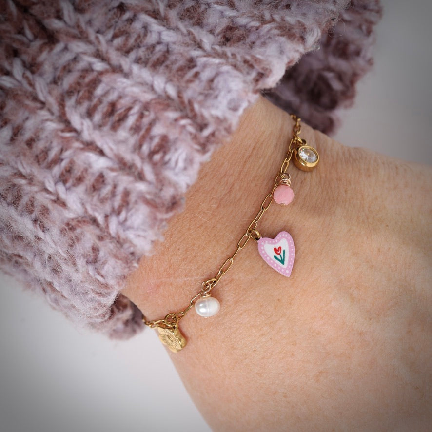 Le bracelet Rosalia se distingue par son cœur rose délicatement illustré, inspiré des fleurs méditerranéennes et de la douceur des beaux jours. Monté sur une chaîne fine en acier inoxydable doré, il apporte une touche tendre et lumineuse au poignet.