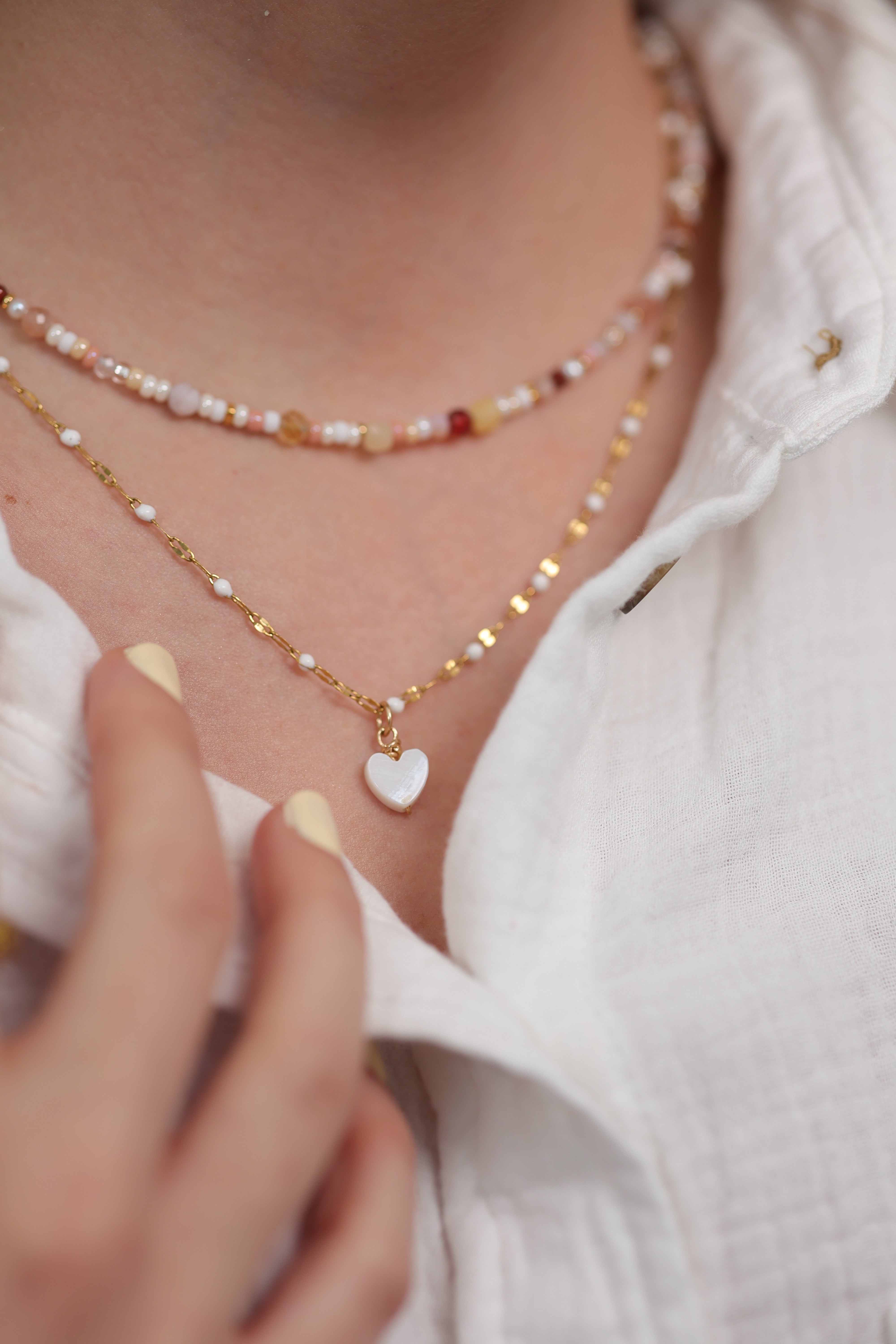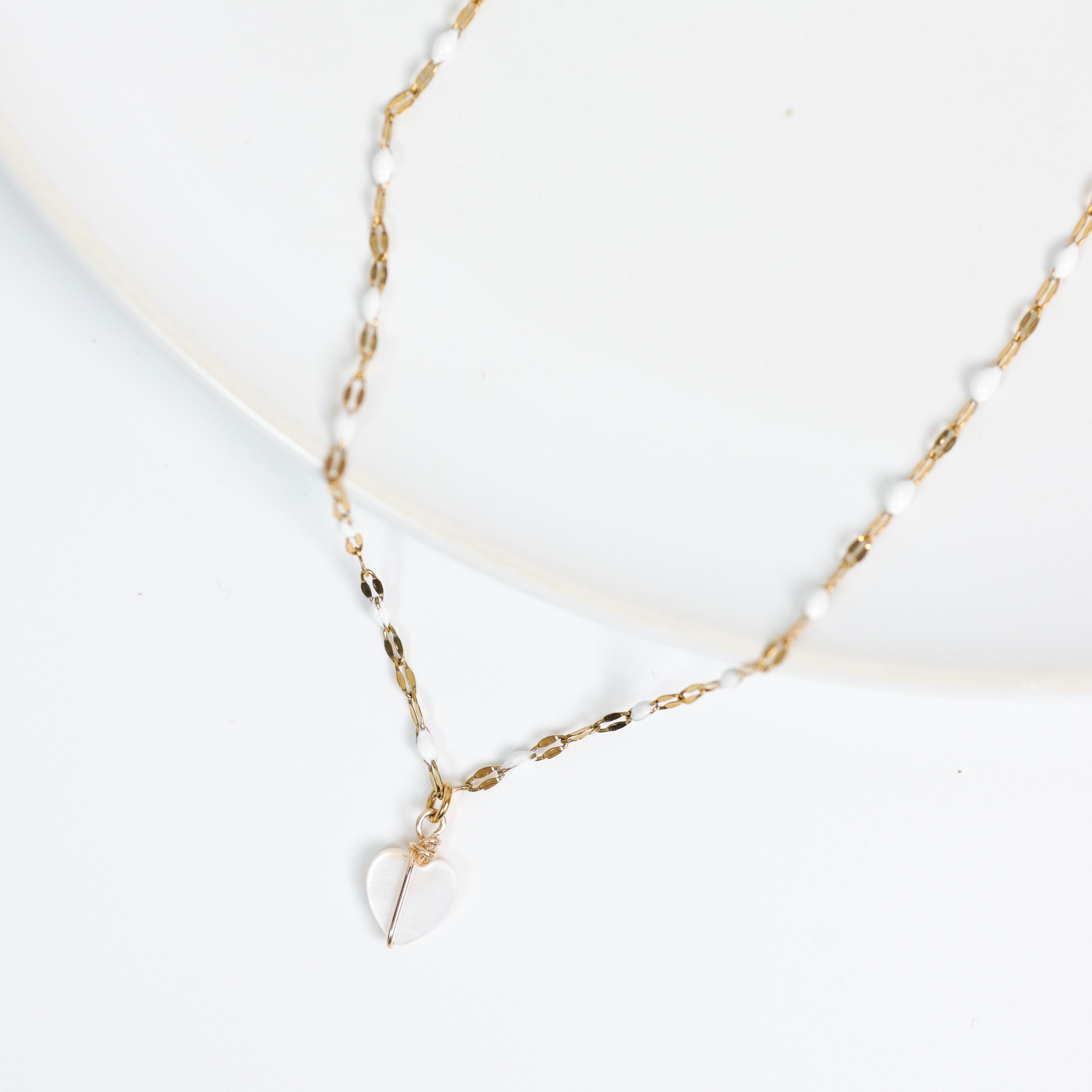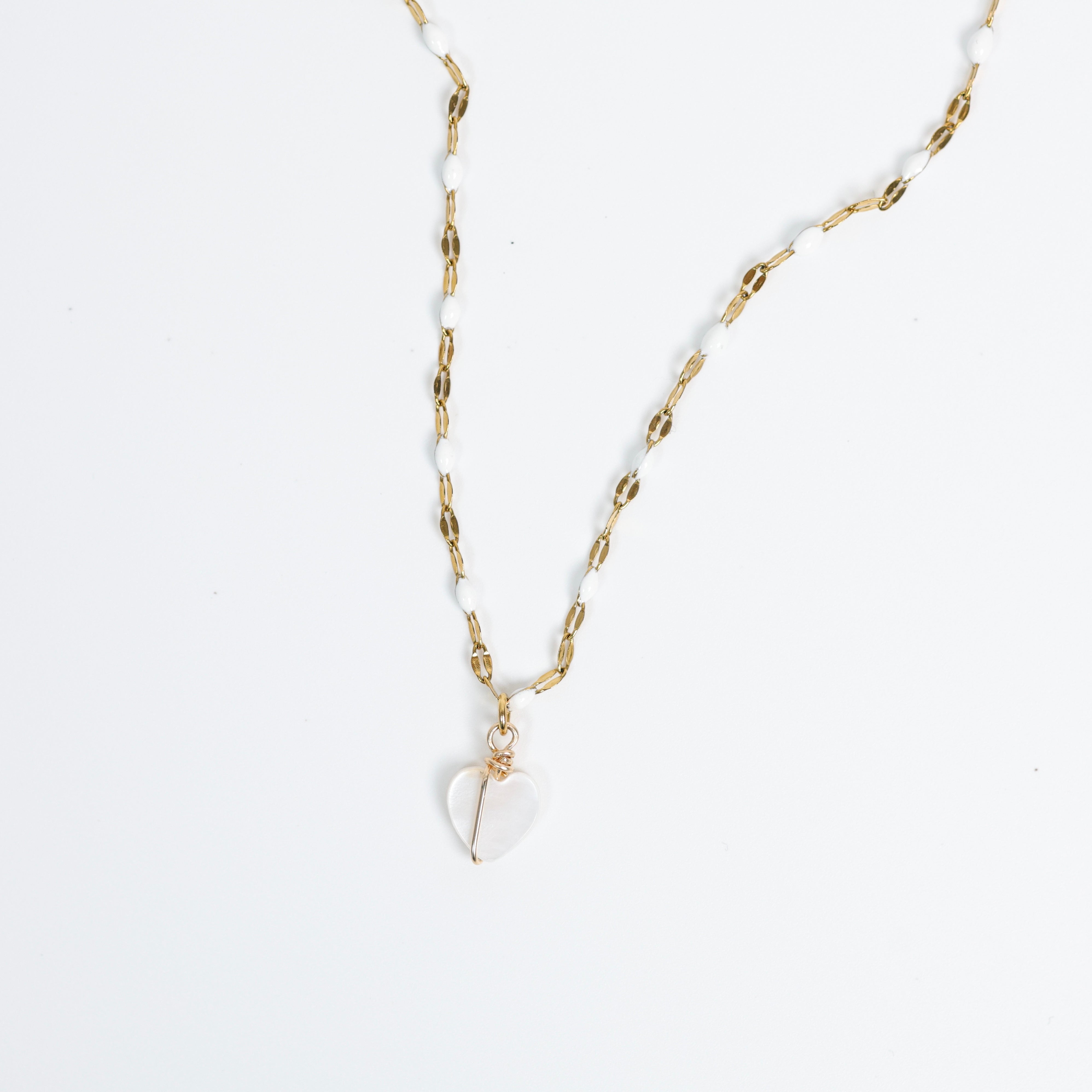 Délicat et lumineux, le collier Coralie se distingue par sa chaîne fine aux maillons effet diamant, ponctuée de résine blanche qui apporte douceur et légèreté. Son petit cœur en nacre, délicatement enveloppé de fil d’or 14k, ajoute une touche féminine et intemporelle.