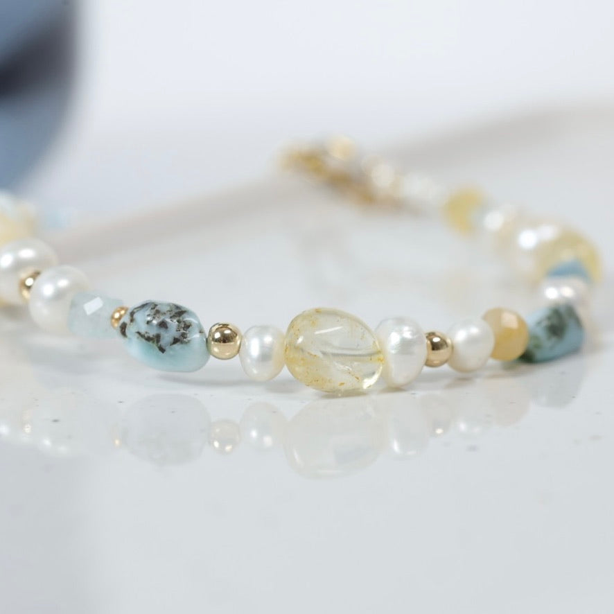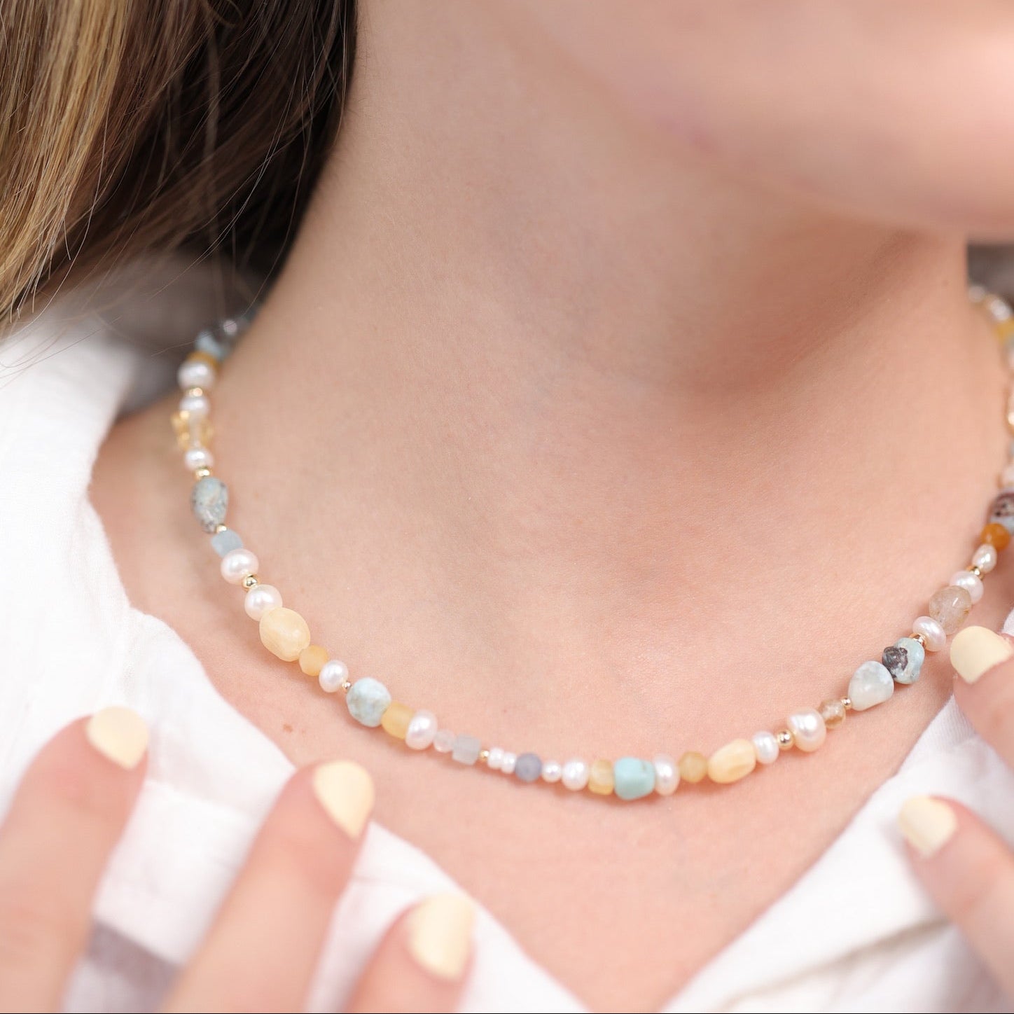 Collier Anaëlle, Perles d’eau douce, citrine, agate, jade, larimar, quartz Herkimer et or rempli 14K