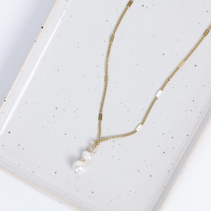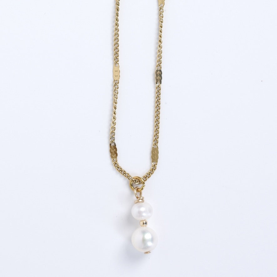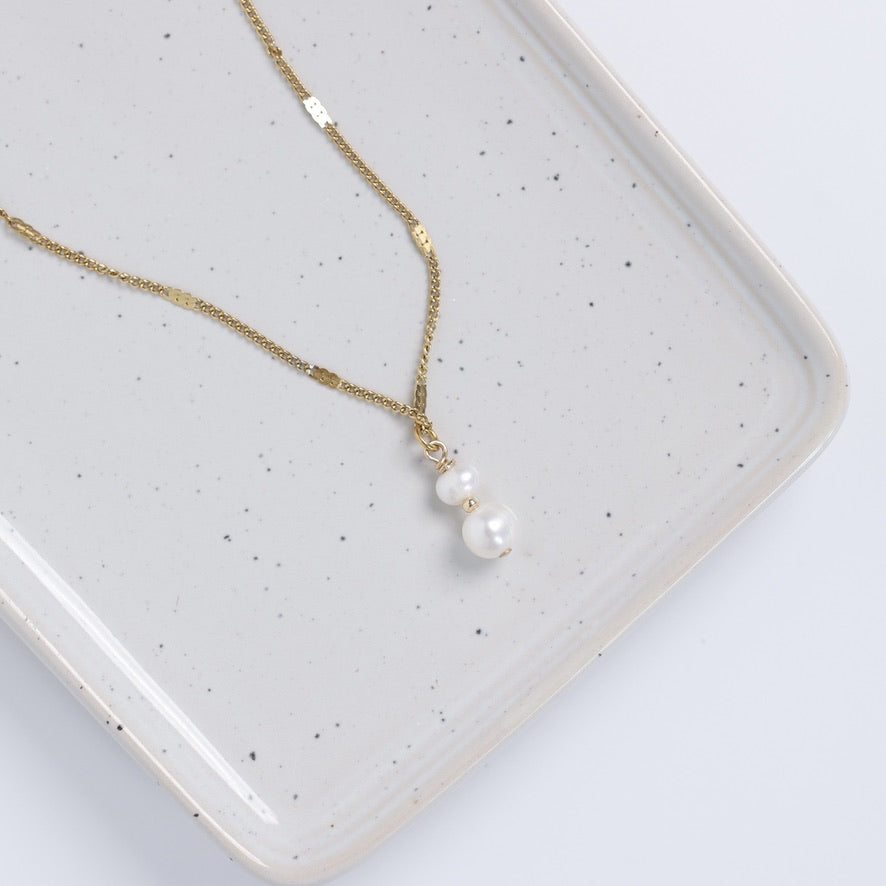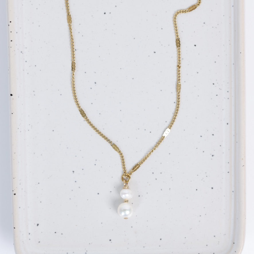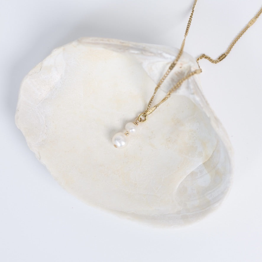Délicat et élégant, le collier Léane met en valeur deux perles d’eau douce superposées, séparées par une petite perle en or 14 carats qui apporte une touche lumineuse et raffinée.